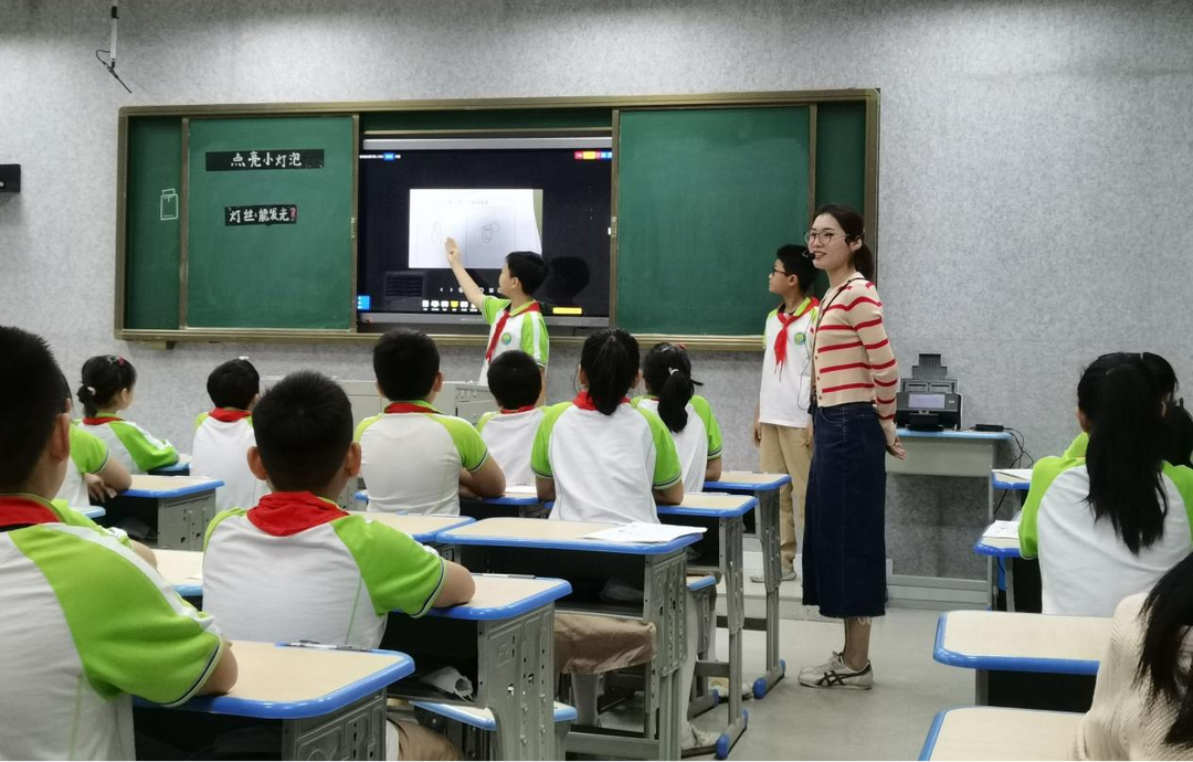 为了引起学生的注意,她让学生像开“盲盒”一样上课,把实验材料装在各种颜色的盒子里,以此设计悬念,让同学们产生好奇心。比如点亮小灯泡,她在盒子里放入一个灯泡、一节电池、一根导线,讲课时一边一个一个地拿出来,一边问学生认不认识,学生因为新奇而积极回答。当学生充分认识材料后,她再次提问学生“能不能用这三种材料自己点亮灯泡”,这时便激起了学生的胜负欲,他们大声喊道“我可以” “我能”,火热的课堂气氛让她既欣慰又感动。