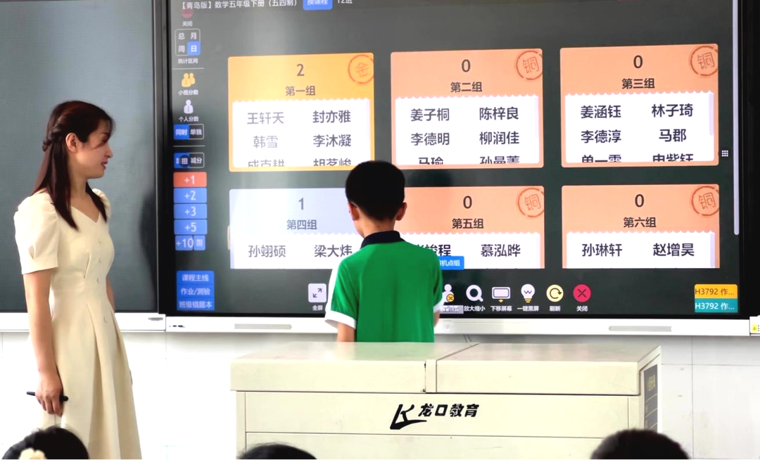 “我们目前采取小组合作的形式,学生们你追我赶,形成比学赶超的学习氛围。”张迪将班级里的学生根据学习能力、学习情况平均划分,每6人分为一组,形成小组合作,达到互帮互助的效果。在小组积分的基础上,她量化评价学生日常行为,规范他们的校园生活。“这个时候,就用到了精准教学云平台,我借助云平台里小组积分的功能,比如学生答对一道题加1分,书写良好加1分,今天讲题了加1分,这样计算比较方便,也能让全班同学对自己小组的得分一目了然。”