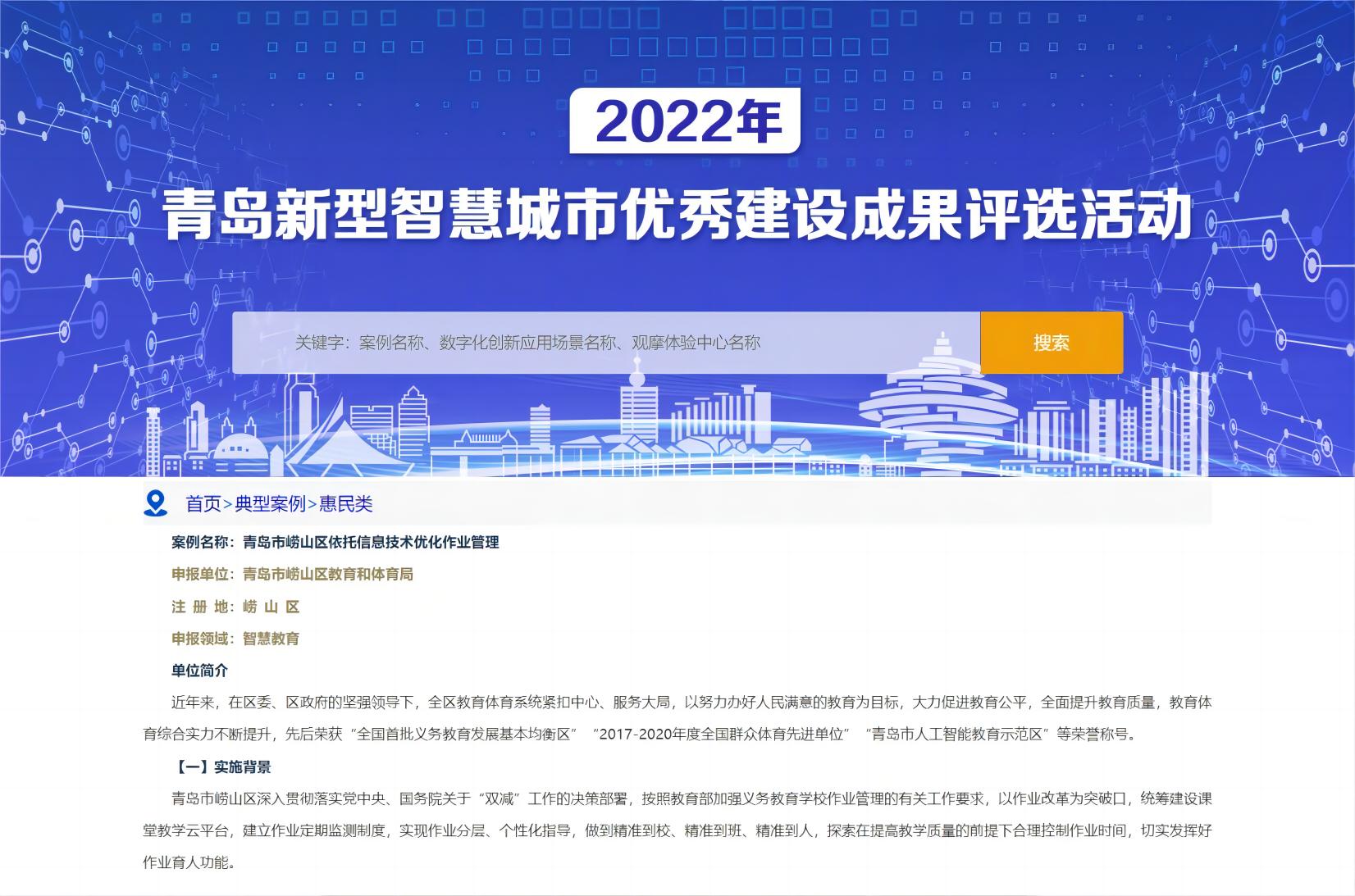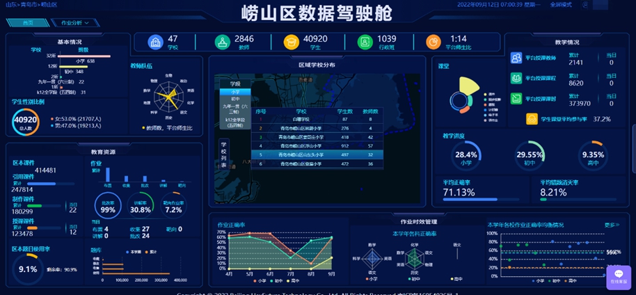 崂山区依托十六进制精准教学云平台优化作业管理项目从2019年开始试用,2020年正式签约,目前已经实施2期,全区中小学师生已经全部部署平台账号,并使用平台开展课堂教学和作业改革,课堂课后两手抓,提高课堂效率,减轻作业负担。