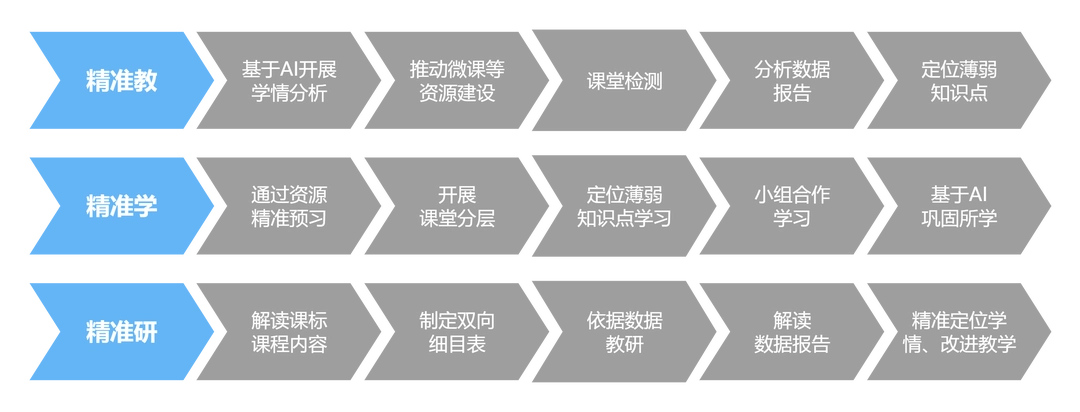 基于AI 的“教—学—研”模式(如图2 所示) 即通过“精准教、精准学、精准研”,使教师从经验型向数据型转变。“精准教”,教师依据数据定位到学生薄弱的知识点,进行有针对性的教学;“精准学”,学生了解自己的薄弱之处,更加明确学习目标与改进方向“;精准研”,开展课题研究后,教师的教研活动都围绕数据展开。通过数据解读来制定教学计划、改进教学方式。学生在课堂上学会自学、互学、问学、“教”学、悟学,教师真正成为“站在学生后面的参与者”。