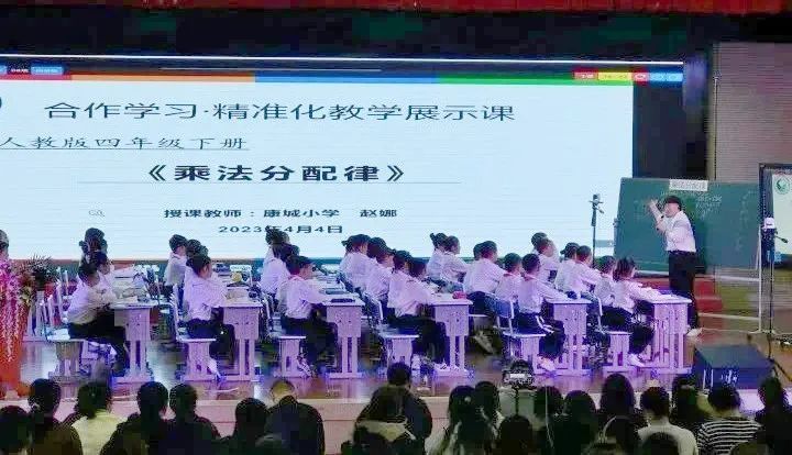 会议中,由学校的数学骨干教师赵娜老师和四年级(8)班的学生一起呈现了《乘法分配律》这节课的学习过程。