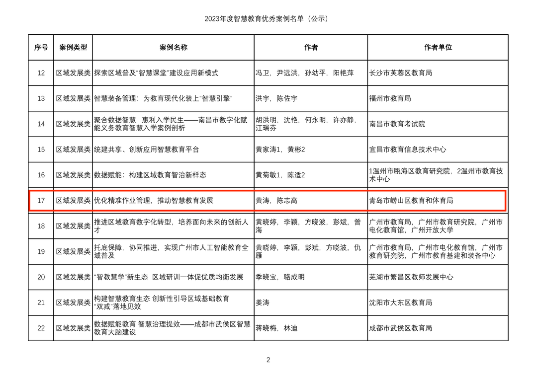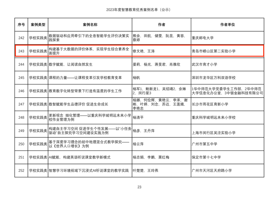 近日,教育部“智慧教育示范区”创建项目专家组秘书处公示《2023年度智慧教育优秀案例名单》,拟确定324个智慧教育优秀案例,其中区域发展类74个、学校实践类226个、解决方案类12个、研究成果类12个。