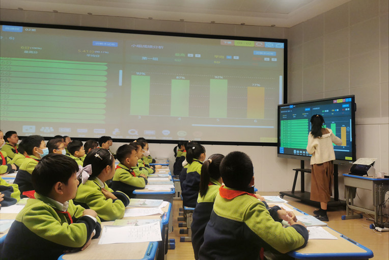在一堂公开课上,学生正在扫描同学们的课堂测试卷,屏幕上实时展示出班级成绩等级、题目的正误率等,同时,老师根据数据反馈对班级薄弱习题进行专项讲解。