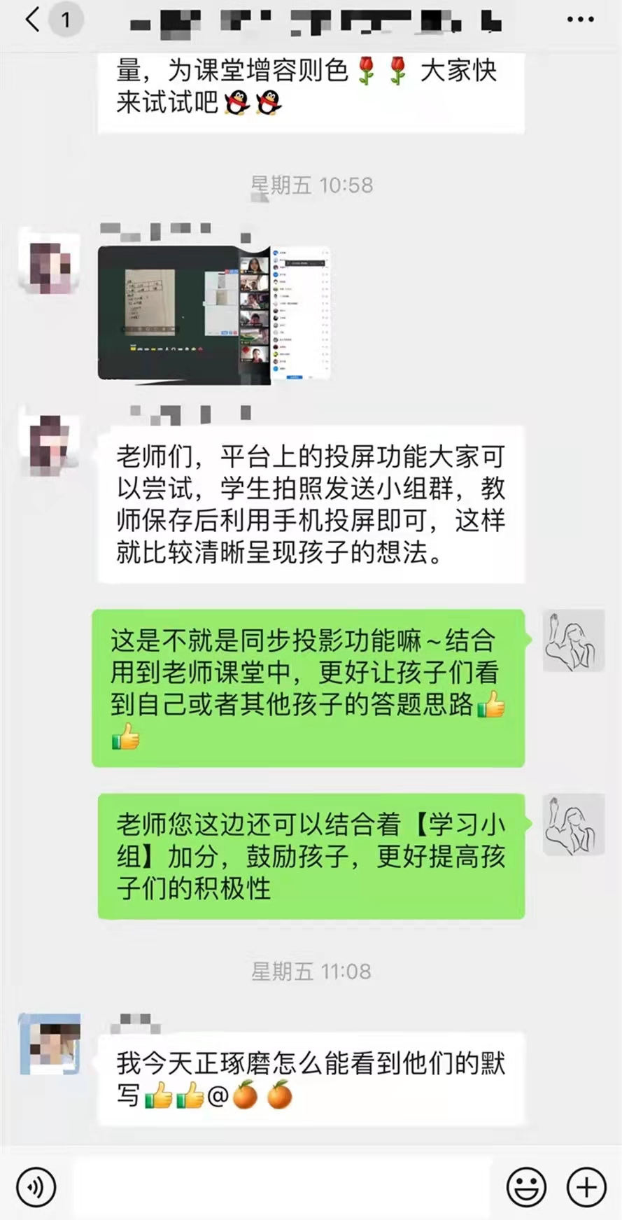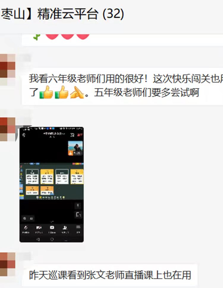 枣山小学老师在微信群分享使用精准教学云平台的课堂经验。