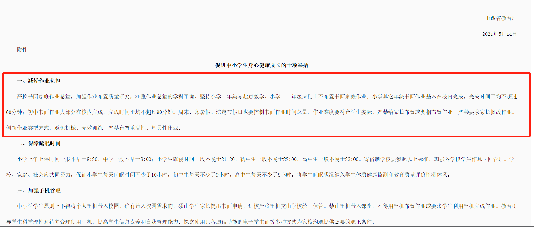 山西省教育厅为进一步落实“双减”政策,印发《促进中小学生身心健康成长十项举措》、《关于组织责任督学进行“十项举措”督导的通知》以及《关于做好义务教育阶段学生作业管理的通知》系列文件,将减轻学生作业负担作为重中之重,“严控书面家庭作业总量,加强作业布置质量研究,注重作业总量的学科平衡”。